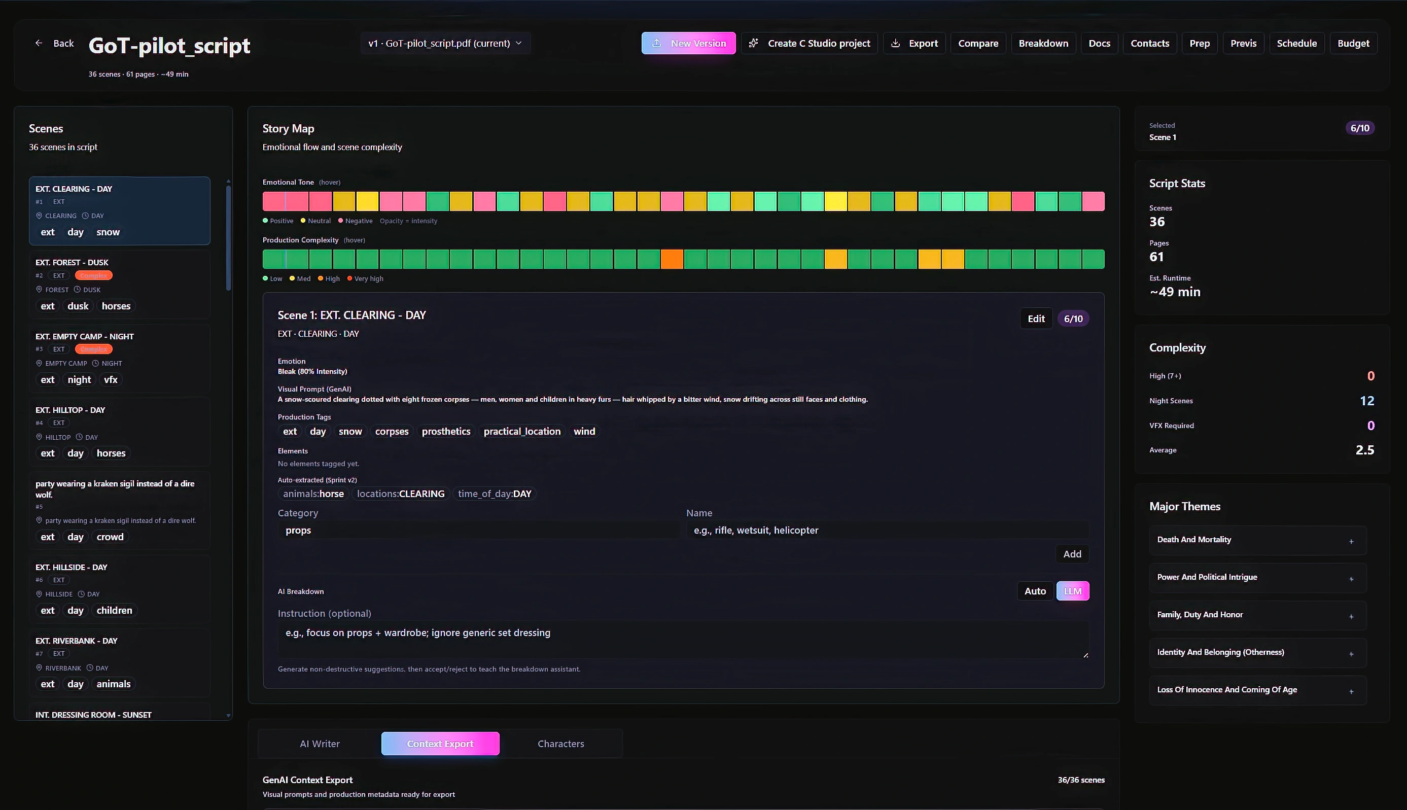 Scenes, characters, themes, locations, and production signals become structured, inspectable context.